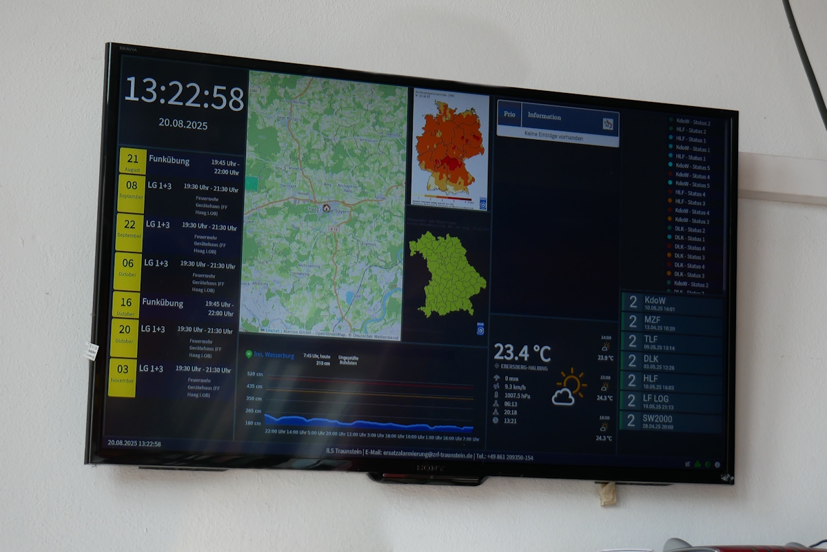 In der Fahrzeughalle sind zwei Alarmmonitore installiert, die sowohl wichtige Einsatzinformationen als auch anstehende Termine anzeigen.