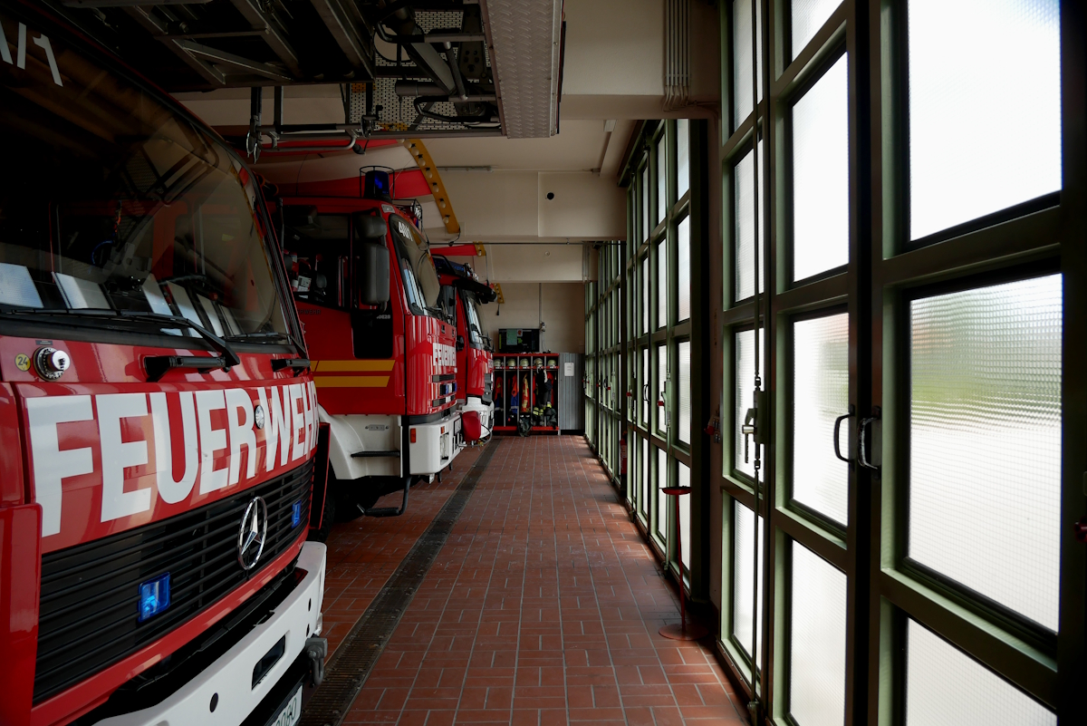Die Spinde der aktiven Mitglieder befinden sich sowohl seitlich als auch hinter den Fahrzeugen.