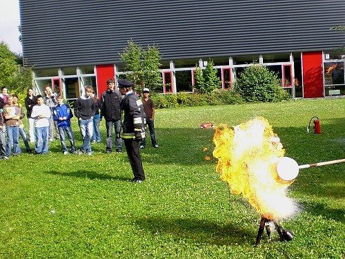 Thomas Göschl und Martin Ellinger wurde den Schülern eine Fettbrandexplosion, ein Flüssigkeits- und Gasbrand vorgeführt sowie der richtige Umgang mit Feuerlöschern nahe