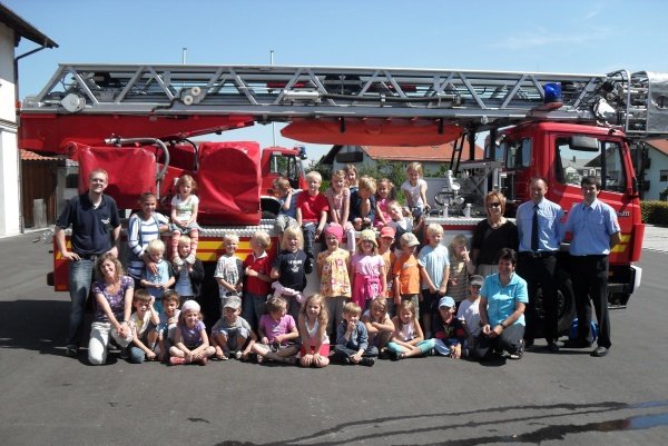 Die Schulanfänger des Kath. Kindergarten statten der Feuerwehr einen Besuch ab. Die Kinder besichtigten das Feuerwehrhaus mit allen Geräten und die Fahrzeuge. Natürlich durften die Kinder auch selbst Hand anlegen und mit einem Strahlrohr einen Eimer umspritzen. Besonderen Spaß bereitete den Kinder das „Durchkrabbeln“ unserer Atemschutzübungsanlage.