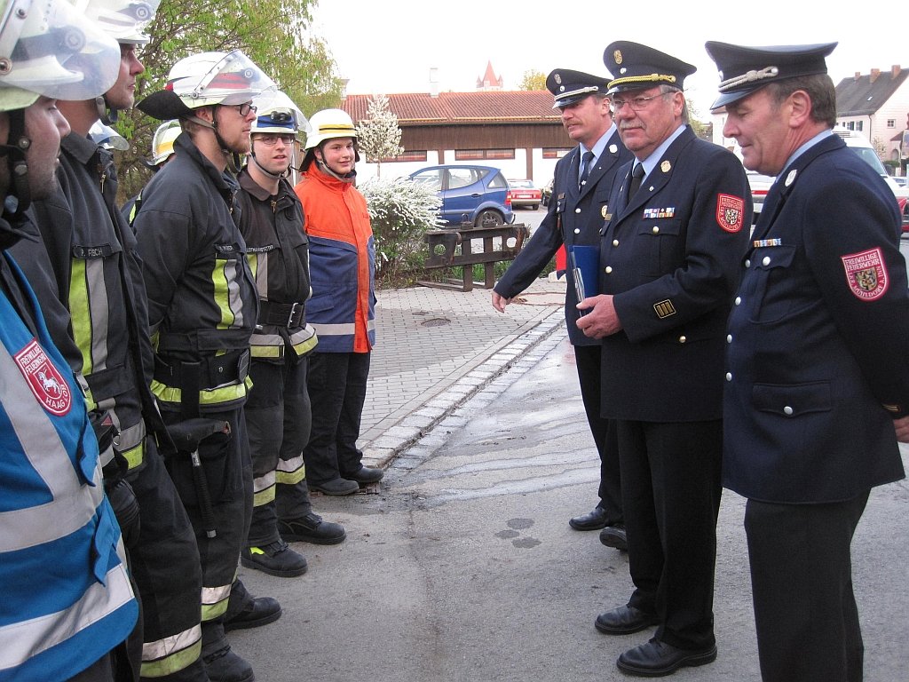 Nach einigen Jahren ohne Durchführung des Wasser-Leistungsabzeichen war es am Freitag den 11. April wieder soweit - zwei Gruppen traten zur Leistungsprüfung an. Nach Auslosung der Aufgaben und Zusatzfragen sowie Ausfüllen des Fragebogens wurde die Fähigkeit des Knotenbindens geprüft. Im Anschluss wurde der Aufbau des Löschangriffs durchgeführt, hierfür hatten die Prüflinge 300 Sekunden Zeit. Letzter Teil der Abnahme war Saugschlauchkuppeln - Maschinist, Wassertrupp und Schlauchtrupp mussten in 100 Sekunden mit A-Schläuchen eine theoretische Wasser-Entnahmestelle aufbauen, welche nach Fertigstellung den Eingangsdruck für 120 Sekunden mit +/- 0,1 bar halten muss. Alle Aufgaben wurden gemeistert, jeder Prüfling konnte am Ende sein neues Abzeichen entgegen nehmen.