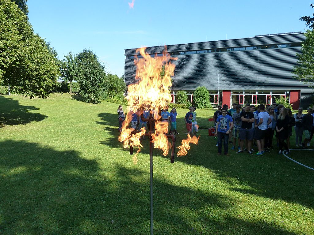 Rund 150 Schülern wurde in drei Gruppen im richtigen Umgang mit dem Feuerlöscher im Brandfall geschult. Nach einer kurzen Begrüßung und Vorstellung der Ausbilder sowie einiger Fahrzeuge, erhielten die Jugendlichen von Dr. Florian Haas einen Einblick ins Thema Brennen und Löschen. Anschließend wurde den Teilnehmern eine Fettbrandexplosion vorgeführt. An unserem „Eisernen Gustav“ konnte das Ablöschen einer Person mittels Löschdecke geübt werden. Gegen Ende der Veranstaltung durften alle ein Feuer mittels Feuerlöscher ablöschen. Wir hoffen mit dieser Veranstaltung eventuell bei dem ein oder anderen Teilnehmer das Interesse für die Haager Wehr geweckt zu haben und natürlich dass sich die Jugendlichen im Brandfalle richtig verhalten.