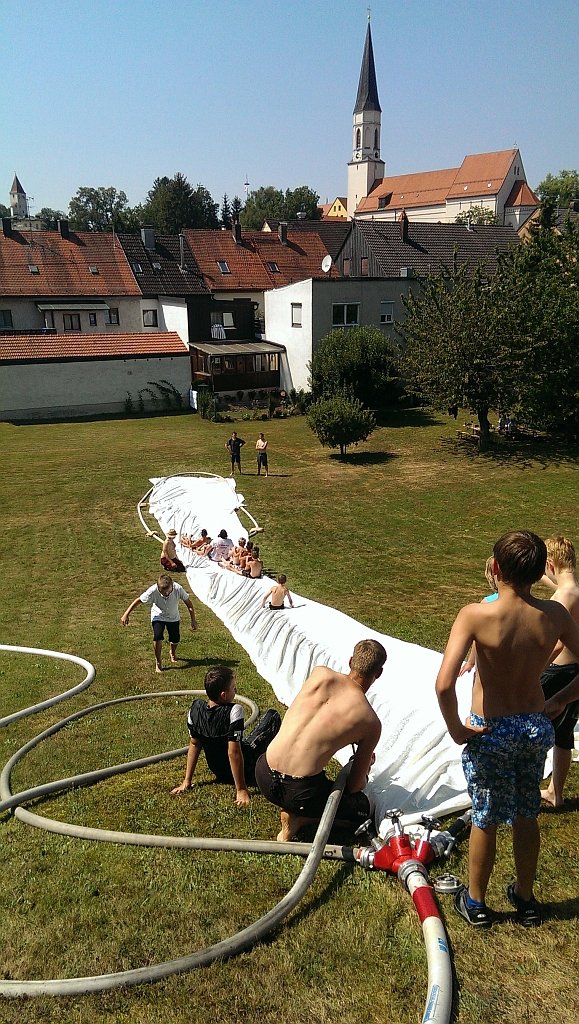Unter der Regie des Marktes Haag wurde wieder ein Kinderferienprogramm organisiert an dem wir uns natürlich beteiligten. Gegen 10 Uhr begrüßten wir die teilnehmenden Kinder und teilten Sie in Gruppen ein. Begleitet von unseren Jugendfeuerwehrlern starteten sie eine Route durch den Ort, auf welcher vorab von uns verschiedenen Stationen aufgebaut wurden. An diesen mussten die Kids spielerisch kleine feuerwehrtechnische Aufgaben bewältigen, am Ende wurden sie mit einer großen Wasserrutsche belohnt. Die Rutsche war passend zu diesem sommerlichen Tag auch das Highlight für alle am Schluss, denn nicht nur die Teilnehmenden Kinder hatten ihren Spaß – auch alle Betreuer gönnten sich eine Abkühlung (und auch einige blaue Flecken ;)