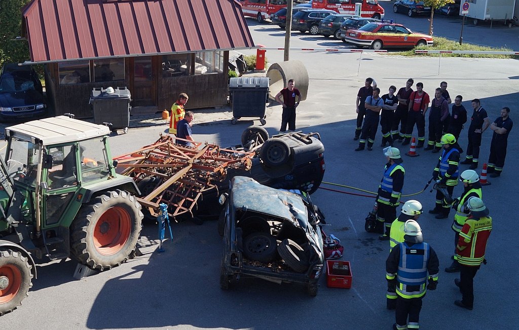 Alle Teilnehmer arbeiteten anschließend die von der FF Haag gestellten Szenarien eigenständig ab. Hierbei legte man großen Wert auf die Einhaltung der Sicherheit, sowie auf die taktische Vorgehensweise. Zwischendurch wußten die Ausbilder immer wieder nützliche Tipps und Tricks, zum Öffnen einer PKW-Tür oder wie setze ich eine Rettungschere am sinnvollsten ohne großem Kraftaufwand ein und gaben diese an die Teilnehmer weiter.