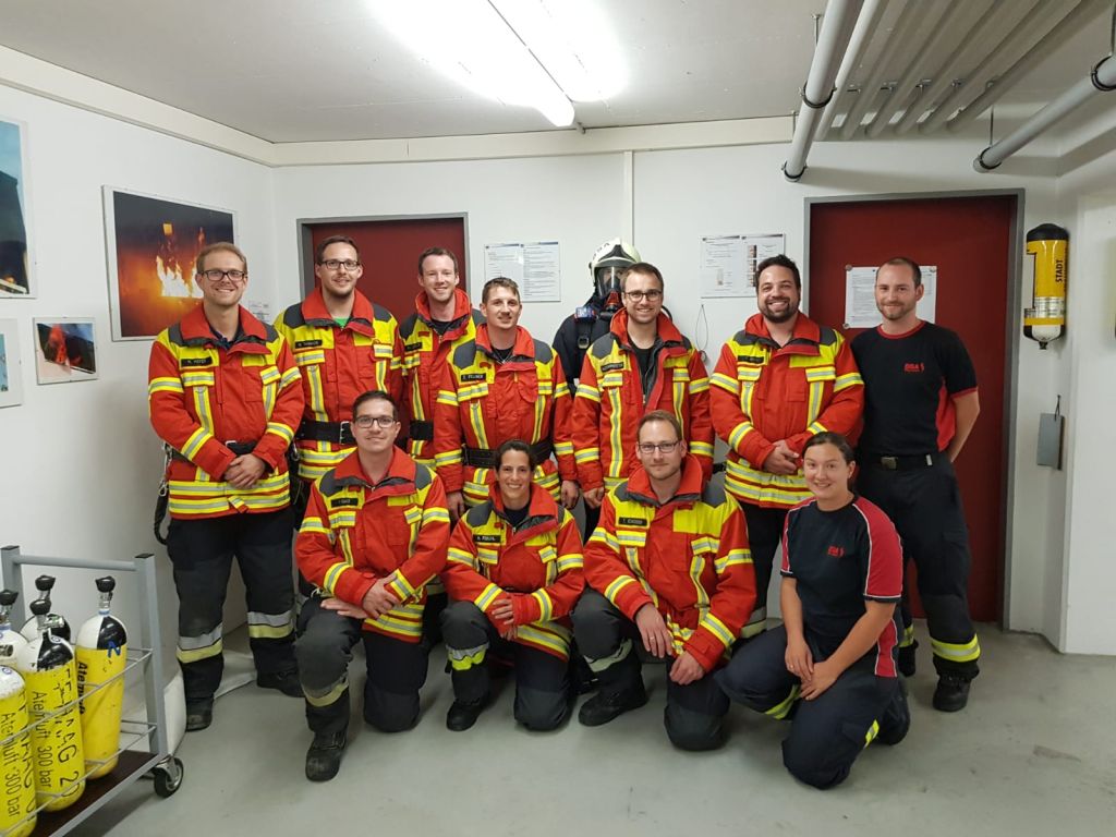 Jeder Trupp hat eine eigene Situation in der Anlage abgearbeitet, wobei zwei vermisste Personen gesucht und gerettet, sowie der Brandherd gelöscht werden musste. Die Geräteträger/-innen waren dabei im ständigen Funkkontakt mit ihrem Gruppenführer. Nach einer individuellen Nachbesprechung ging es für alle abschließend noch einmal an den Brandherd für eine Hitzegewöhnung.