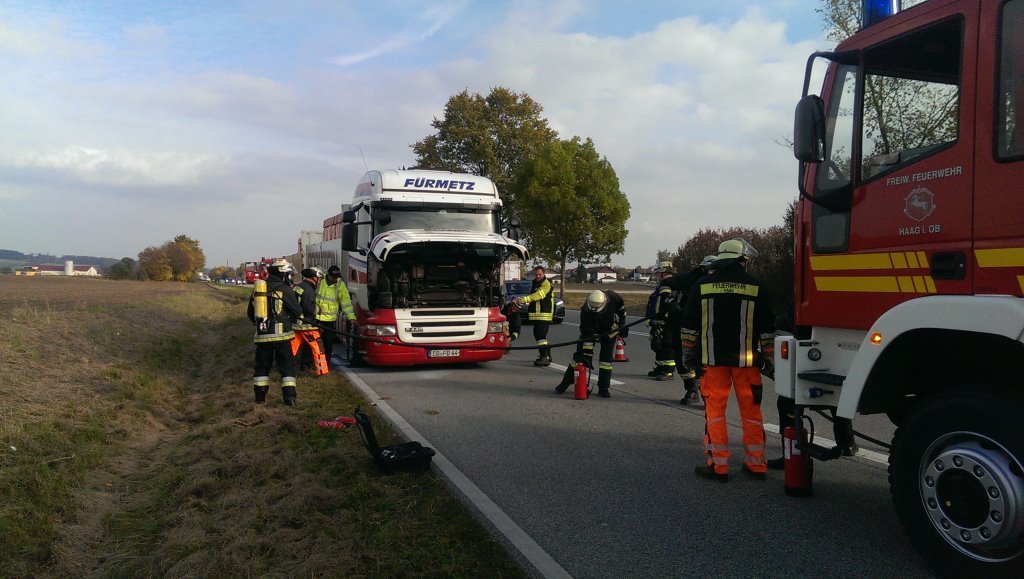 Ein heiß gelaufener Motor war möglicherweise die Ursache des Brandes im Motorraum eines Ziegeltransporters am Donerstag Nachmittag auf der B12 Ausfahrt Haag-West. Einige Ersthelfer konnten mittles Feuerlöscher den Entstehungsbrand bereits vor unserem Eintreffen ablöschen. Die Dieselleitung wurde abgeklemmt und der gesamte LKW von den Batterien getrennt. Durch das Kippen des Führerhauses konnte der Motorraum wieder auskühlen. Die Einsatzstelle wurde von der Feuerwehr abgesichert, Brandschutzmaßnahmen aufgebaut und auslaufende Betriebsstoffe aufgefangen.