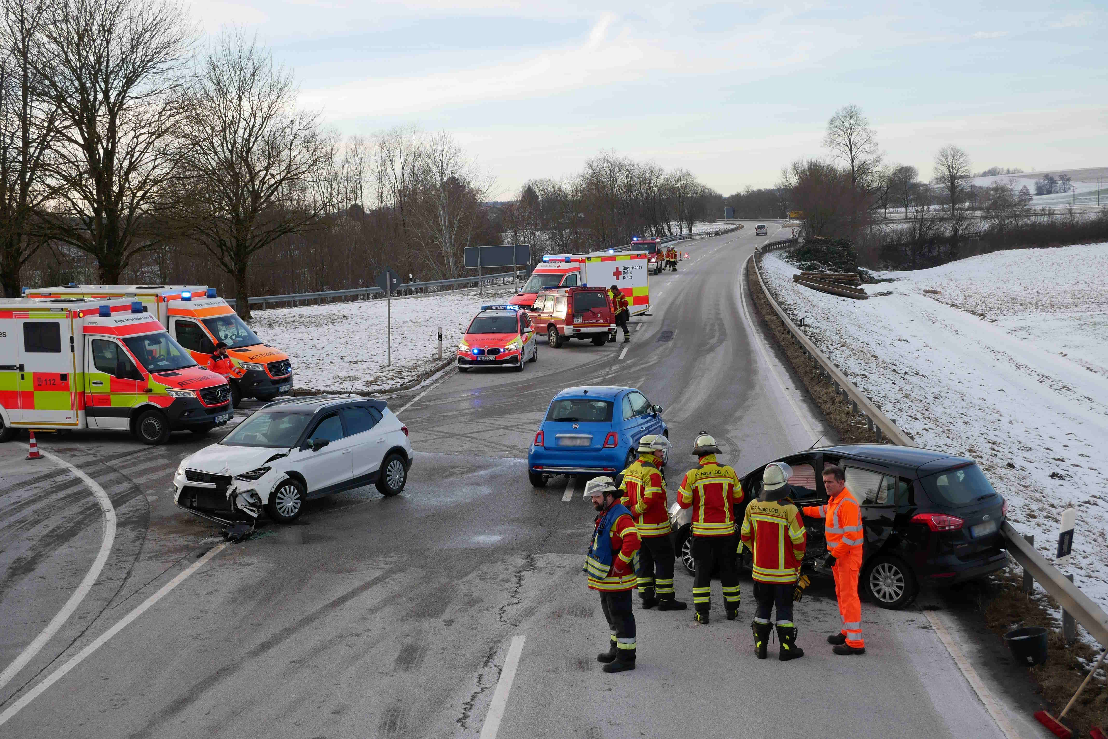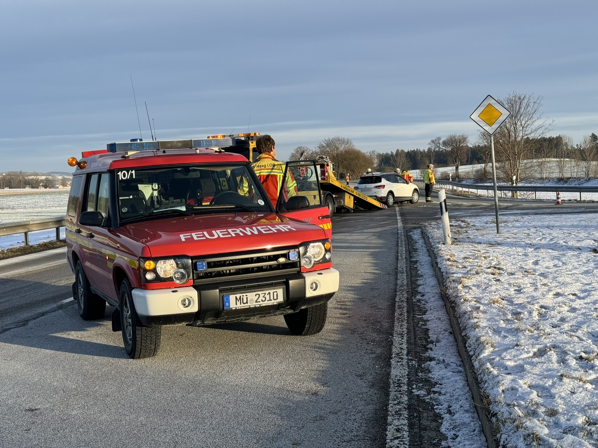 Um 15 Uhr wurden wir zu einem Verkehrsunfall auf die B12 gerufen. Ein auf der Bundesstraße fahrendes Auto war dort mit einem auffahrenden Fahrzeug kollidiert. Die Patienten wurden durch den Rettungsdienst versorgt, während wir die Straße sperrten und renigten. Nachdem die Unfallfahrzeuge abgeschleppt worden waren, konnten wir die Einsatzstelle verlassen