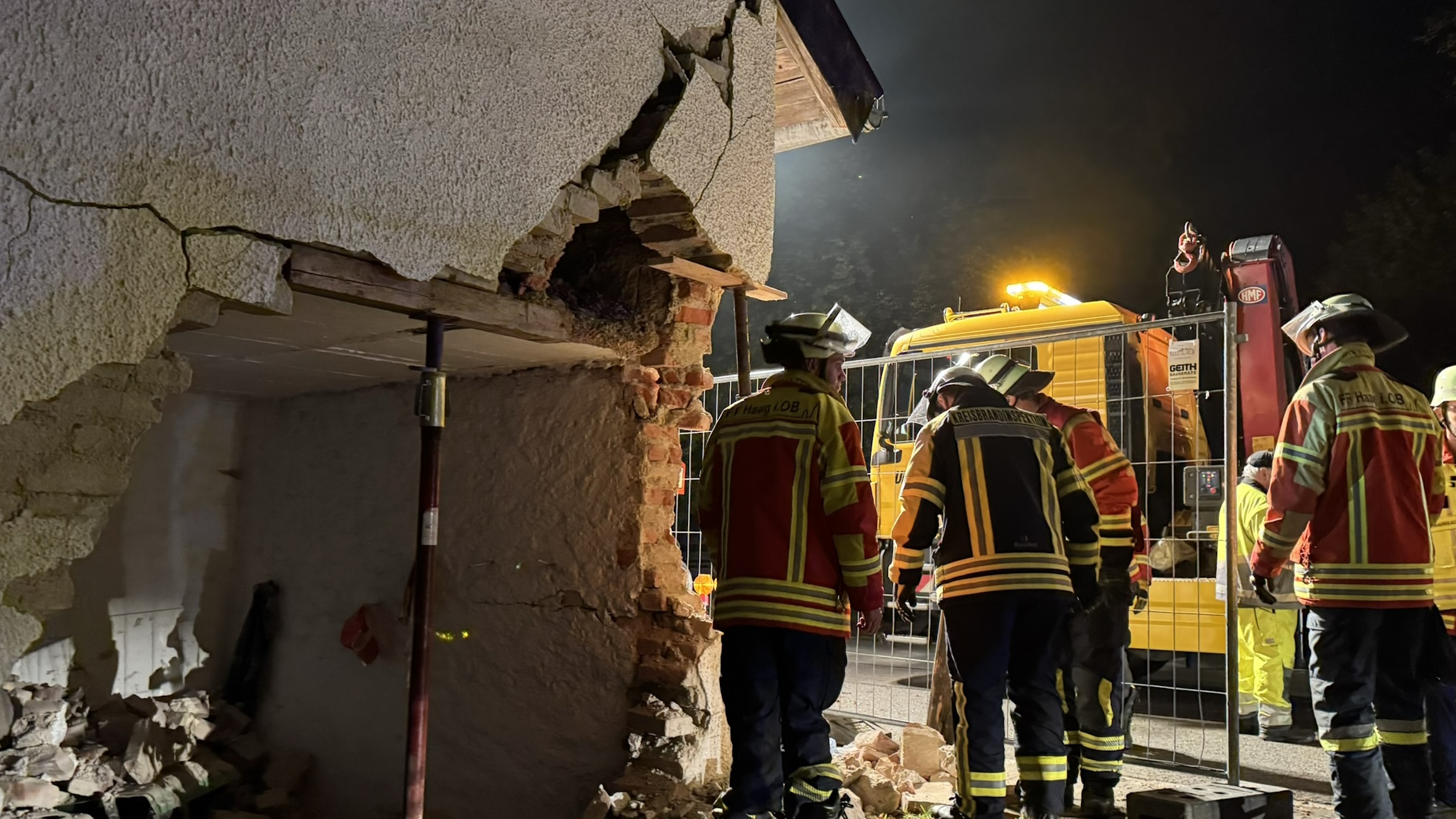 Die Garage wurde durch den Einschlag stark beschädigt und galt als einsturzgefährdet, weswegen wir sie mit Baustützen provisorisch absicherten. Zudem sperrten wir den Gefahrenbereich um das entstande Loch ab.