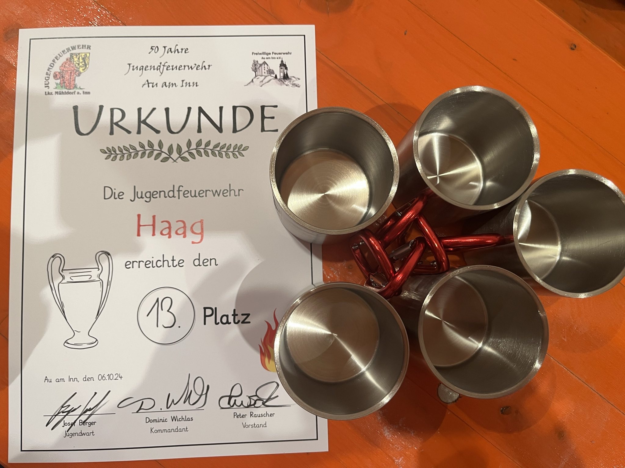 Unsere Jugendfeuerwehr nahm am vergangenen Samstag am Wissenstest 2025 in Aschau am Inn teil. Insgesamt stellten sich 23 Jugendliche den verschiedenen Stufen des Tests, der in diesem Jahr unter dem Thema „Verhalten im Notfall und Erste Hilfe“ stand. Dabei mussten die Teilnehmerinnen und Teilnehmer unter anderem einen Notruf absetzen, eine Person in die stabile Seitenlage bringen und das richtige Verhalten beim Auffinden einer bewusstlosen Person erläutern. Ein Teilnehmer konnte sogar die Stufe 7 erreichen, welche die höchste Stufe des Wissenstests darstellt. |