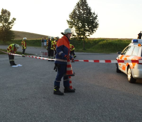 bei der Realschule. Der LKWfahrer fuhr mit überhöhter Geschwinigkeit und unter Alkoholeinfluss in den PKW, der sich draufhin überschlug und auf dem Dach liegen blieb. In dem PKW befanden sich vier Jugendliche, dargestellt von uns, die garnicht bis schwerst Verletzt waren. Bis das BRK eintraf, kümmerten sich Ersthelfer der Feuerwehr um die Verletzten, welche mit Schere und Spreitzer aus dem Fahrzeug geholt wurden. Als das BRK ankam, kümmerten sich die Sanitäter sofort um die Verletzten, legten ein EKG an, haben Infusionen gegeben und mit den Patienten gesprochen. Währenddessen bauten die Feuerwehrler einen Dekontaminierungsplatz auf, um die eingestzten Atemschützle