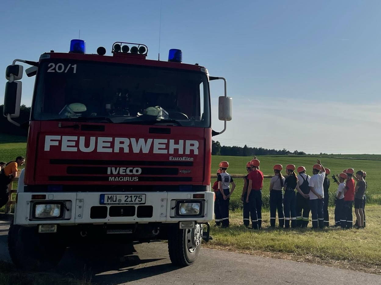 Endlich begann nach den Ferien wieder der Übungsbetrieb. Heute fuhren wir mit unserem Tanklöschfahrzeug (TLF), dem Lastwagen (LKW) und dem Mehrzweckfahrzeug (MZF) auf eine Wiese bei Aicha. Dort übten wir den Aufbau eines Löschangriffs sowie die Wasserentnahme aus offenen Gewässern.