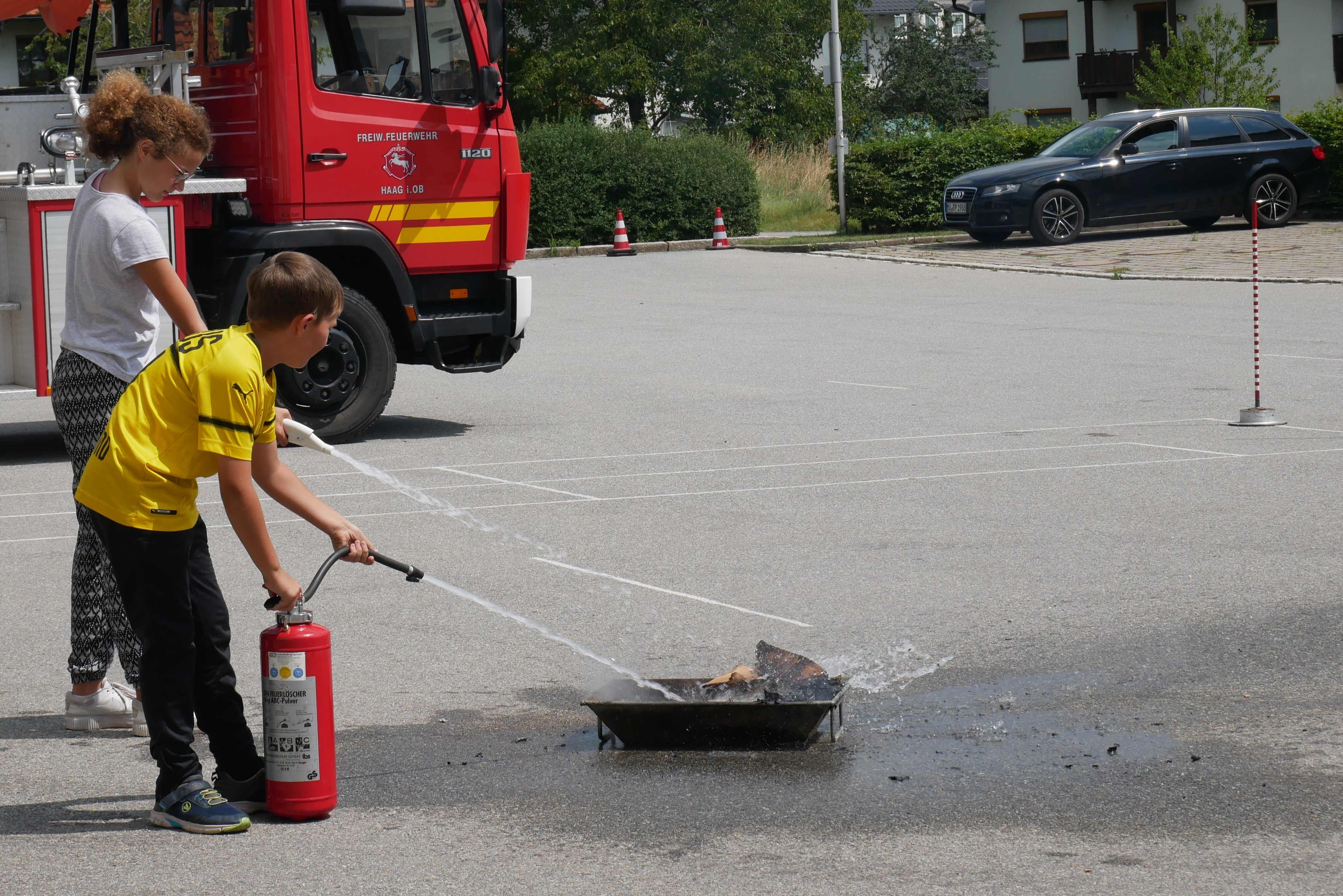 Nach dem Mittagessen erlernten sie wichtige Vorgehensweisen in der Brandschutzerziehung und den Umgang mit Feuerlöschern. Natürlich durfte auch die Höhenfahrt mit der Drehleiter nicht fehlen.